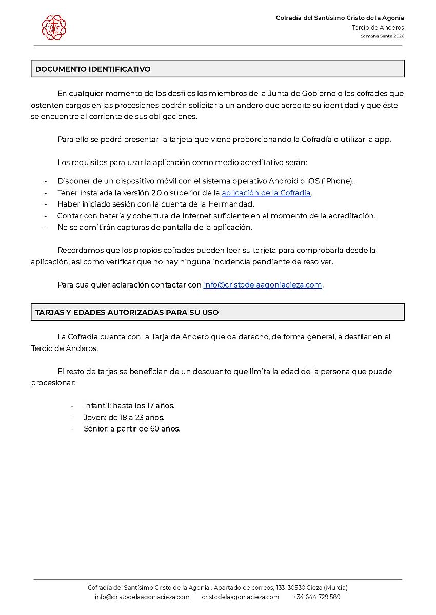 Documentación relativa a la Semana Santa de 2026 para los cofrades del Tercio de Anderos