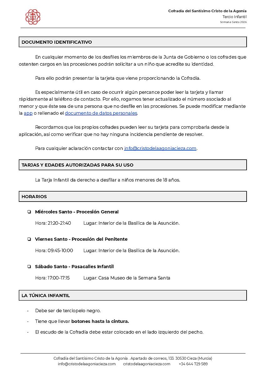 Documentación relativa a la Semana Santa de 2026 para los cofrades del Tercio Infantil